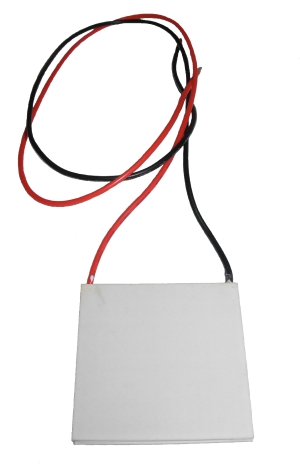 module 4cm x 4cm, (1.6" x 1.6") with 127 p-n couples. When current passes through two different conductors, heat is produced in one and absorbed in the other. Peltier first described this in 1834. Modern semiconductor materials can make p-n junctions which produce large temperature differences. This 4cm x 4cm x 4mm thick module contains 127 p-n junctions connected electrically in series but thermally in parallel. Maximum temperature difference = 59 deg C at 30 deg C ambient with no heat load. Maximum ratings = 13.5V, 4.4A, 36W.