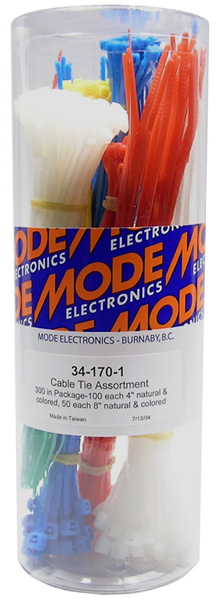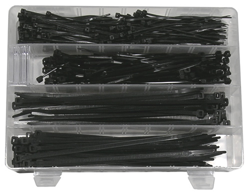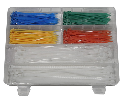 ASSORTMENT 300 assorted cable ties in reusable plastic tube. |