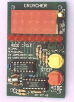Kit 42. Number Cruncher 68HC705K1Binary/hexadecimal/decimal/2's complement converter using a K1 uC. Eight LEDs are in a row. Step turns them on in turn by counting up using binary arithmetic. The 3-digit display shows the decimal equivalent (between 0 & 255) of the binary pattern. Press mode and the equivalent hexadecimal value (between 0 & FF) of the binary pattern is displayed. Mode and step pressed together will count backwards. If step is kept depressed the LEDs will rapidly count through the complete binary cycle in about 9 seconds. But that is only half the capability of the Kit. Pressing mode again will show the 2's complement binary pattern of the previously displayed binary number. The equivalent hex and decimal values of the 2's comp number are also shown on the 3-digit display. Double-sided small PCB, 49mm x 79mm, 1.95" x 3.1". Supplied with box. 9V battery required. Display turns off after 1 minute with no keypress. Complete annotated program code supplied on floppy disk. Reviewed in Electronics Australia, 9/94, p82 - 86. Scan of PCB Number System Decoder 115K Back to top |